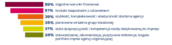 i kompetencja osoby przydzielonej do imprezy (31 proc.), doświadczenie, rekomendacje, pozytywne referencje, bogate portfolio imprez zrealizowanych przez agencję (28 proc.).