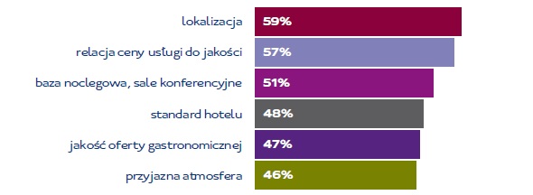 Decyzja o organizacji wydarzenia w konkretnym hotelu jest podyktowana przede wszystkim charakterem imprezy. Jeśli chodzi o spotkania, konferencje i wystawy dla 59 proc. respondentów najbardziej istotna jest lokalizacja. Relację ceny usługi do jakości wskazało 57 proc., bazę noclegową, sale konferencyjne 51 proc., standard hotelu 48 proc., jakość oferty gastronomicznej 47 proc., a przyjazną atmosferę 46 proc.