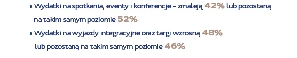 Zdaniem 300 respondentów w 2014 roku wydatki na: spotkania, eventy i konferencje – zmaleją (42 proc.) lub pozostaną na takim samym poziomie (52 proc.). Jak prognozują badani, wydatki na wyjazdy motywacyjne i targi wzrosną (48 proc.) lub pozostaną na takim samym poziomie (46 proc.).