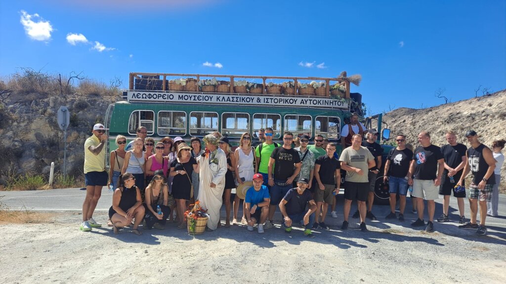 Zdecydowanie najbarwniejszy i kulminacyjny punkt programu „Spotkanie z Dionizosem” . Począwszy od "porwania" grupy przez Dionizosa do udekorowanego, zabytkowego autobusu do "pracy" w winnicy. Na miejscu przyszedł czas na zbiór winogron, które następnie zostały przewiezione do winiarni. Tam, w duchu dawnych tradycji, uczestniczki udeptywały winogrona w kadziach, dokładnie tak, jak robiono to przed wiekami. Całość dopełnił lunch w wiosce Omodos oraz degustacja wyśmienitych lokalnych win, serów i świeżego chleba.